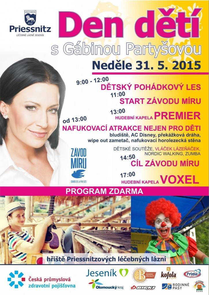DEN DĚTÍ S GÁBINOU PARTYŠOVOUNeděle 31. 5. 2015 - hřiště Priessnitzových léčebných lázní 9:00 - 12:00 DĚTSKÝ POHÁDKOVÝ LES 11:00 START ZÁVODU MÍRU 13:00 HUDEBNÍ KAPELA PREMIER od 13:00 NAFUKOVACÍ ATRAKCE NEJEN PRO DĚTI 14:50 CÍL ZÁVODU MÍRU 17:00 HUDEBNÍ KAPELA VOXEL | |