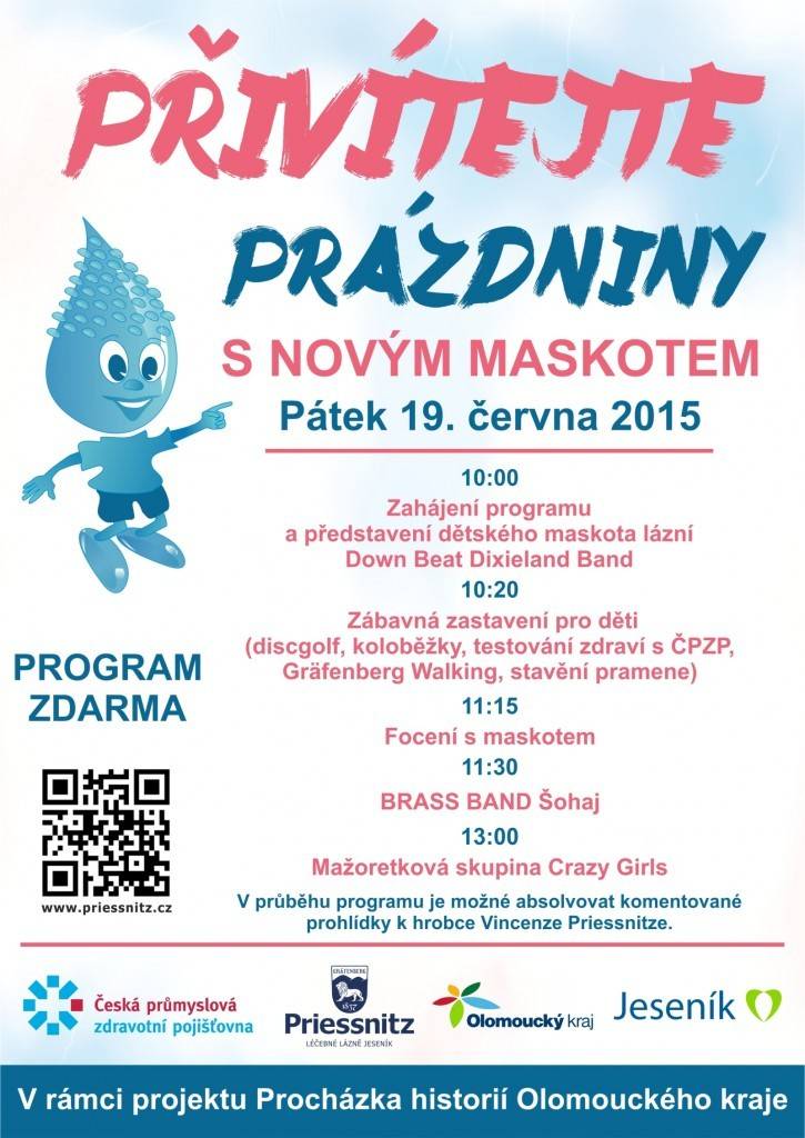 PŘIVÍTEJTE PRÁZDNINY s novým maskotemPátek 19. června 2015 10:20 Zábavná zastavení pro děti (discgolf, koloběžky, testování zdraví s ČPZP, Gräfenberg Walking, stavění pramene) 11:15 Focení s maskotem 11:30 BRASS BAND Šohaj 13:00 Mažoretková skupina Crazy Girls V průběhu programu je možné absolvovat komentované prohlídky k hrobce Vincenze Priessnitze. | |