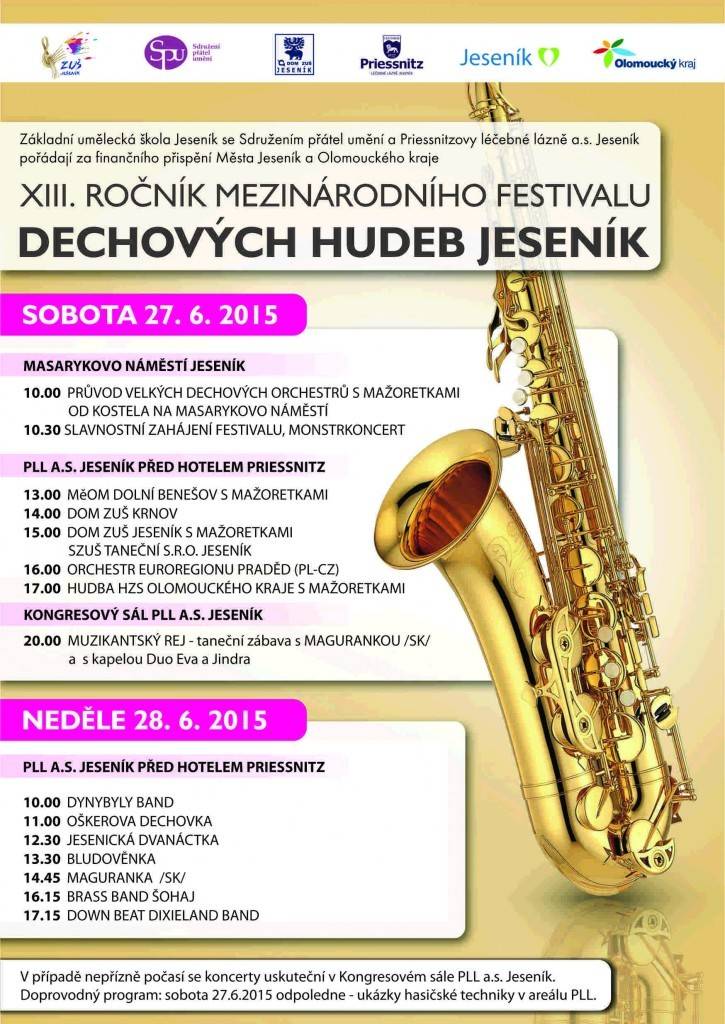 XIII. MEZINÁRODNÍ FESTIVAL DECHOVÝCH HUDEB JeseníkZveme Vás na festival dechových hudeb v Jeseníku, který se uskuteční 27. - 28. 6. 2015. | |