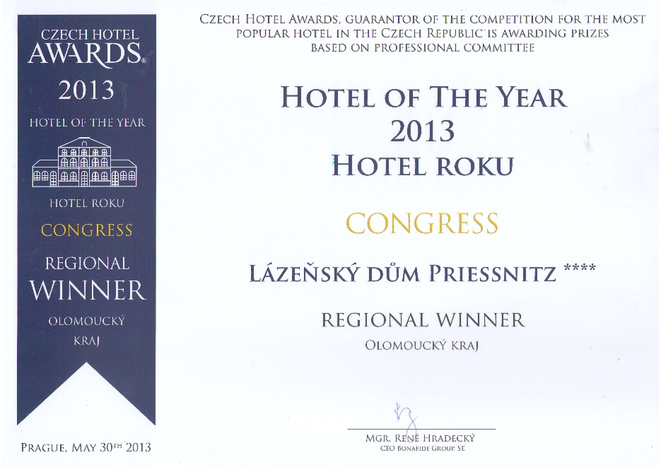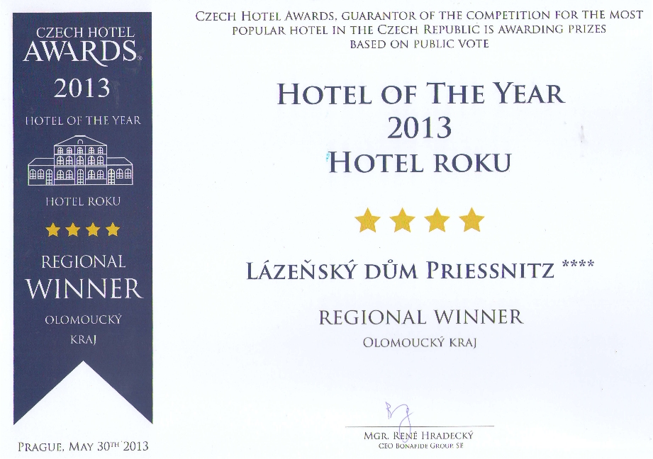 CZECH HOTEL AWARDS 2013Hotel Priessnitz**** získal ocenění Czech Hotel Awards 2013 v soutěži o nejoblíbenější hotel v Olomouckém kraji. Czech Hotel Awards – Hotel roku 2013 je přehlídkou českých hotelů nabízejících nejkvalitnější služby a klade si za cíl zmapovat a zviditelnit nejlepší hotely po celé České republice. Ocenění získal hotel Priessnitz**** hned ve dvou kategoriích: