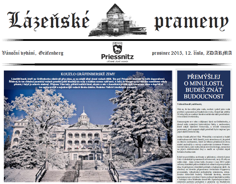 VYŠLO VÁNOČNÍ ČÍSLO LÁZEŇSKÝCH PRAMENŮDvanácté číslo Lázeňských pramenů vyšlo na Vánoce, najdete v něm ovšem i nevánoční témata. V historii se opět ponoříte do Priessnitzovy doby, dozvíte se, co byla tzv. rohová kúra, jaký osud měla Priessnitzova dcera Sofie, ale dostanete také pozvání na akce roku 2016 nebo se třeba začtete do nového seriálu lázeňských fejetonů. | |