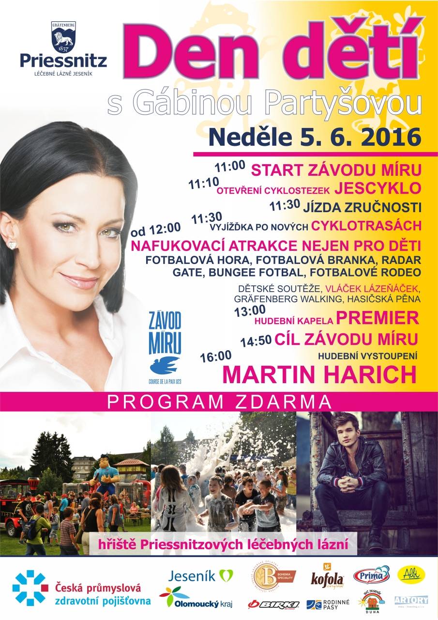 V LÁZNÍCH VYSTOUPÍ MARTIN HARICHVašim ratolestem bude patřit lázeňské hřiště celou neděli 5. června. DEN DĚTÍ bude plný her a soutěží, nebudou chybět nafukovací atrakce či zumba. Těšit se můžete na koncert MARTINA HARICHA a kapely PREMIER! Zároveň odstartujeme 3. etapu Závodu míru a otevřeme cyklistické okruhy JESCYKLO. | |