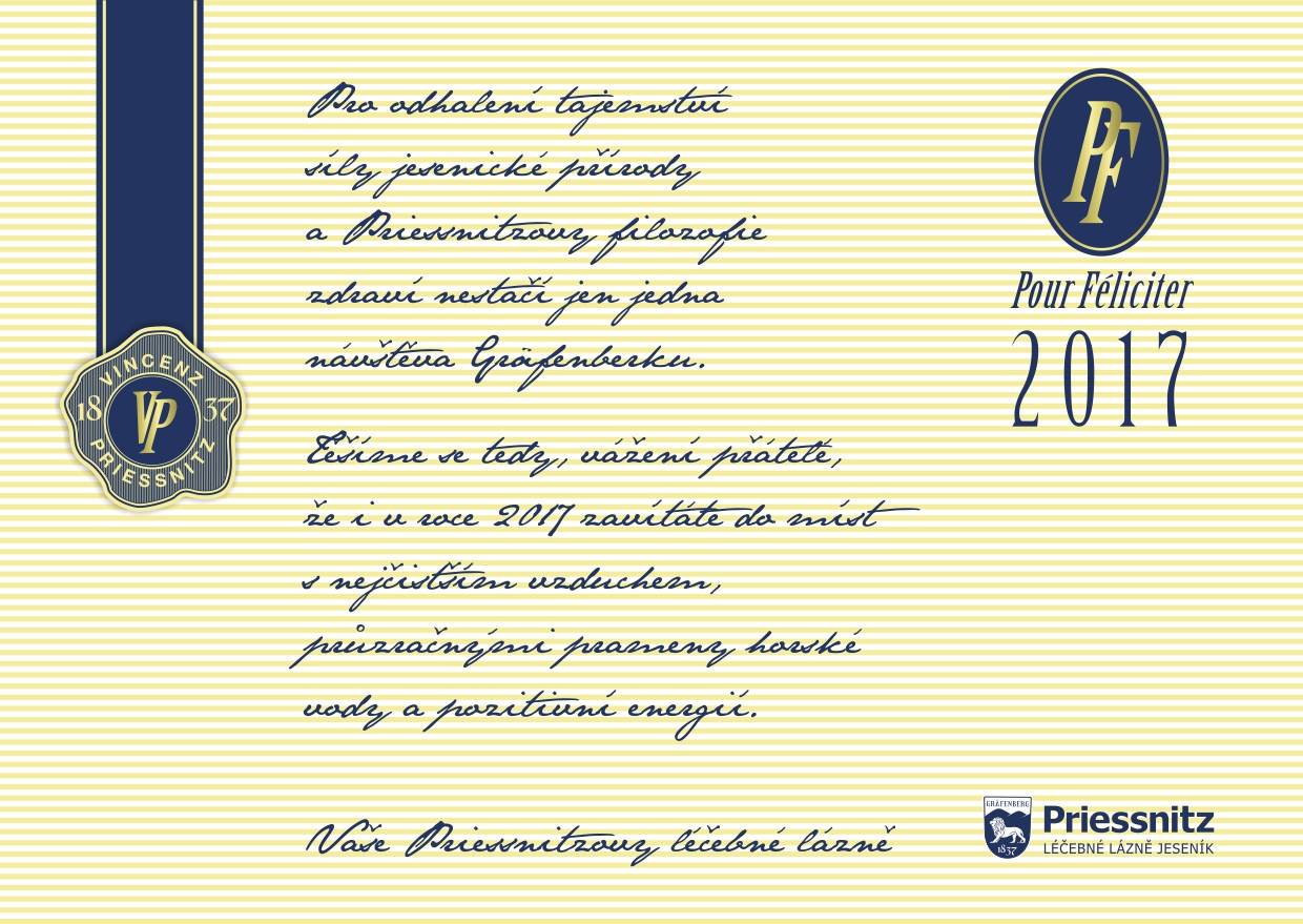 POUR FÉLICITER 2017Pro odhalení tajemství síly jesenické přírody a Priessnitzovy filozofie zdraví nestačí jen jedna návštěva Gräfenberku. Těšíme se tedy, vážení přátelé, že i v roce 2017 zavítáte do míst s nejčistším vzduchem, průzračnými prameny horské vody a pozitivní energií. Vaše Priessnitzovy léčebné lázně | |