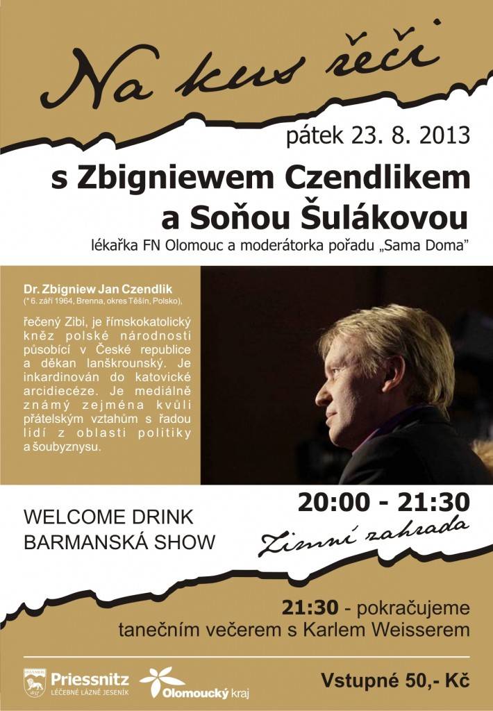 Na kus řeči s Zbigniewem Czendlikema Soňou Šulákovoulékařka FN Olomouc a moderátorka pořadu „Sama Doma” 23. 8. 2013 Dr. Zbigniew Jan Czendlik řečený Zibi, je římskokatolický knězpolské národnosti působící v České republice a děkan lanškrounský. Je inkardinován do katovické arcidiecéze. Je mediálně známý zejména kvůli přátelským vztahům s řadou lidí z oblasti politiky a šoubyznysu. WELCOME DRINK 21:30 - pokračujeme tanečním večerem s Karlem Weisserem Vstupné 50,- Kč | |