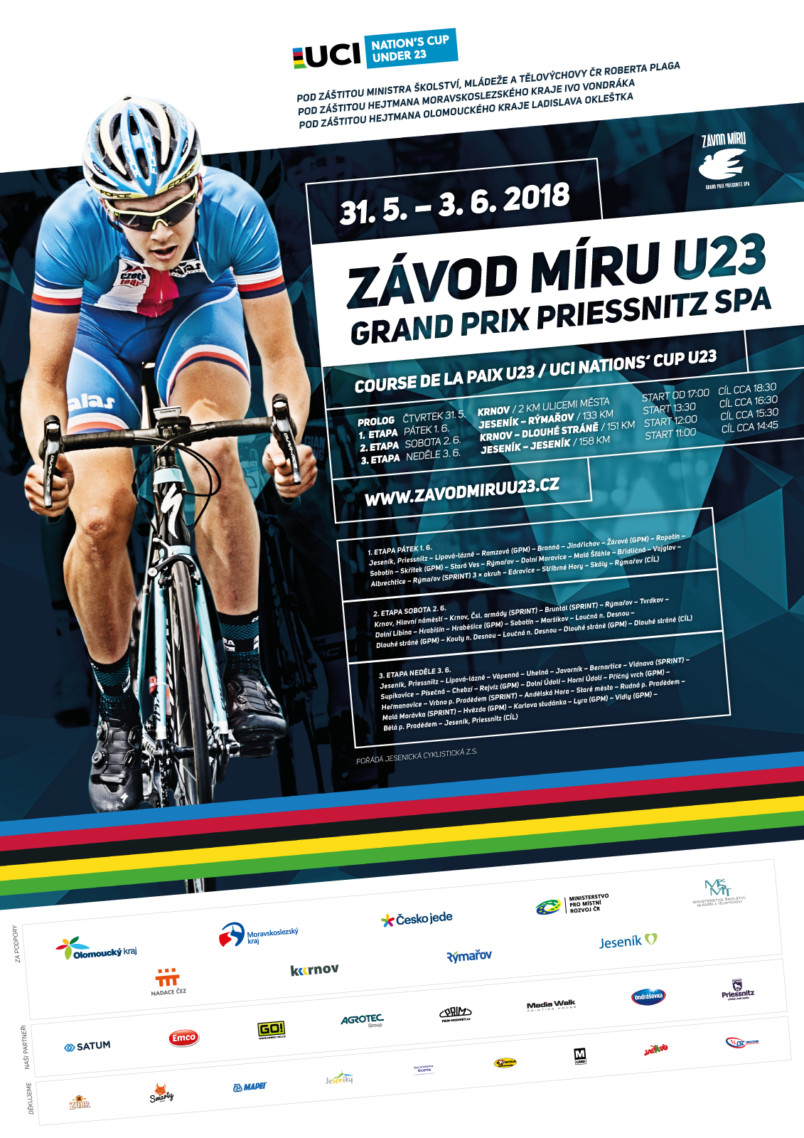 Závod míru U23 Grand Prix Priessnitz spa 2018Závod míru U23 opět přiláká světovou elituCelkem dvaadvacet šestičlenných týmů se postaví ve čtvrtek 31. května na start letošního Závodu míru jezdců kategorie U23 v prologu v Krnově. V podniku kategorie UCI Nations Cup U23 tak diváci uvidí opravdu světový výkvět této kategorie. "Pro mě je pocta, že mohu být čestným prezidentem takového podniku světové úrovně po sportovní stránce, ale i regionu to jistě pomůže především v turistickém ruchu," řekl prezident závodu a náměstek hejtmana Olomouckého kraje František Juna na dnešní tiskové konferenci v centrále Czech Tourism v Praze. Závod míru je jeden ze šesti podniků N´Cupu a spolu s Tour de Avenir jediným etapovým. "Ty dva závody jsou nejprestižnější, jsou velmi důležité i pro kvalifikaci na mistrovství světa. Letitou prací jsme si vybudovali obrovské renomé. Týmy přijíždějí již několik dnů dopředu ve snaze projet si trať a vybojovat co nejlepší výsledky," řekl ředitel závodu Jaroslav Vašíček z pořadatelské firmy Jesenická Cyklistická, z.s. Nejednodušší je úvodní rovinatý dvoukilometrový prolog, ale v dalších etapách na jezdce čeká tvrdá cyklistická dřina v kopcích. "Kromě dvou výjezdů nejtěžšího kopce v České republice v sobotní etapě na Dlouhé stráně čeká na závěr závodníky Jesenické horské peklo se sedmi vrchařskými prémiemi s cílem před hotelem Priessnitz v Jeseníku," pokračoval Vašíček s tím, že na startu kromě jezdců Austrálie a Kolumbie budou všichni nejlepší. Na závod se těší i prezident Českého svazu cyklistiky Petr Marek. "Závod míru U23 má pro nás veliký přínos, světová cyklistika k němu hledí s úctou. Je to jeden z největších a nejlepších závodů u nás a pochopitelně i ve světě. I když u nás za dva měsíce pořádáme ME, tak toto je takové malé mistrovství světa," řekl Petr Marek. Reprezentační kouč Tomáš Konečný poukázal na dvě skvělá vystoupení Michala Schlegela ve dvou minulých ročnících. "To byly skvělé výsledky a navázat na ně bude těžké. Když se podíváme do historie, tak je tam plno jmen jezdců, kteří jezdí ve WorldTour včetně v současného době lídra Giro d´ Italia Simona Yatese. Naším lídrem bude podle dosavadních výsledků v sezoně Jakub Otruba, v kopcích by měl silný i Jiří Petruš," řekl Tomáš Konečný. Program ZM U23 2018: 31. května: prolog v Krnově (2 km) Zdroj: | |