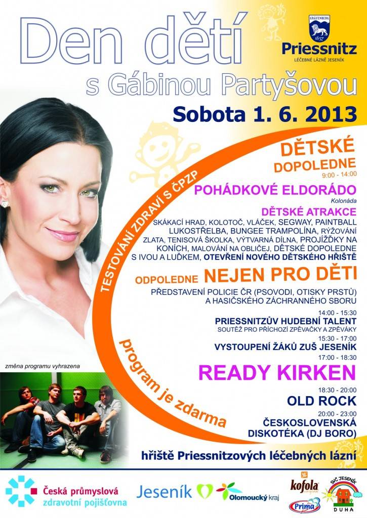 Den dětí s Gábinou PartyšovouSOBOTA 1.6.20139:00 - 14:00 DĚTSKÉ DOPOLEDNE POHÁDKOVÉ ELDORÁDO - Kolonáda Dětské atrakce - skákací hrad, kolotoč, vláček, Sedway, paintball, lukostřelba, Bungee trampolína, rýžování zlata, tenisová školka, výtvarná dílna, projížďky na koních, malování na obličej, dětské dopoledne s Ivou a Luďkem, otevírání nového dětského hřiště 14:00 - 15:30 PRIESSNITZŮV HUDEBNÍ TALENT 15:30 - 17:00 VYSTOUPENÍ ŽÁKŮ ZUŠ JESENÍK 17:00 - 18:30 READY KIRKEN18:30 - 20:00 OLD ROCK20:00 - 23:00 ČESKOSLOVENSKÁ DISKOTÉKA (DJ BORO) Změna programu vyhrazena. | |