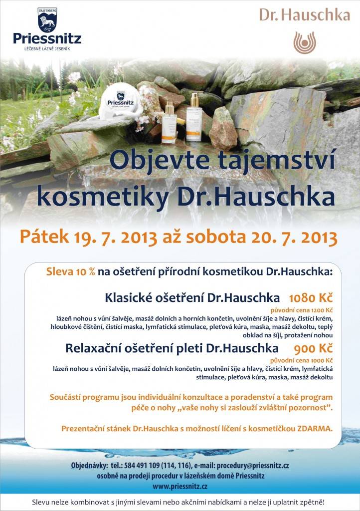 Objevte tajemství kosmetiky Dr.Hauschka Pátek 19. 7. 2013 až sobota 20. 7. 2013Sleva 10 % na ošetření přírodní kosmetikou Dr.Hauschka: Klasické ošetření Dr.Hauschka 1080 Kč Součástí programu jsou individuální konzultace a poradenství a také program péče o nohy „vaše nohy si zaslouží zvláštní pozornost”. Prezentační stánek Dr.Hauschka s možností líčení s kosmetičkou ZDARMA. | |