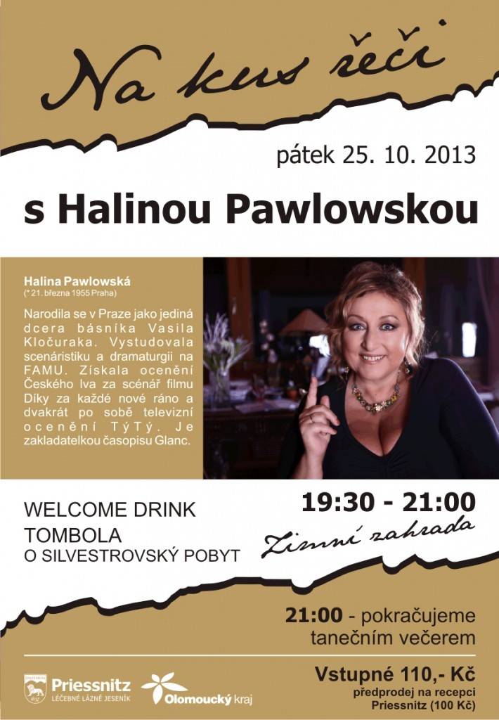 Na kus řeči s Halinou Pawlowskou 25. 10. 2013 Halina Pawlowská Narodila se v Praze jako jediná dcera básníka Vasila Kločuraka . Vystudovala scenáristiku a dramaturgii na FAMU. Získala ocenění Českého lva za scénář filmu Díky za každé nové ráno a WELCOME DRINK 21:00 - pokračujeme tanečním večerem Vstupné 110,- Kč | |