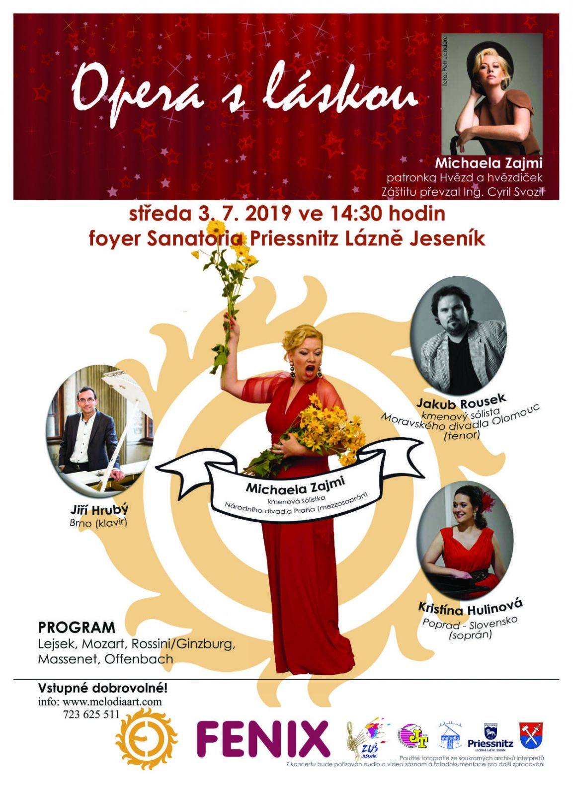 Opera s láskouAtraktivní projekt Hvězdy a hvězdičky v čele s patronkou projektu Michaelou Zajmi (mezzosoprán) sólistkou Národního divadla Praha, pod záštitou ing. Cyrila Svozila. Program: Lejsek, Camille Saint-Saëns, Smetana, Verdi. Dále účinkují: Klavírní duo Hrubých z Brna, Alena Kučerová (soprán) z Brna, Jan Kučera (basbaryton) z Brna, Jakub Rousek (tenor), sólista Moravského divadla Brno a Jarmila Pohlová (dramaturgie, scénář a moderování). Připravujeme i menší překvapení. Středa 3. 7. 2019 ve 14.30, foyer Sanatoria Priessnitz. Vstupné dobrovolné. Pořádá FENIX Group, MELODIA Art, JT a PLL a.s. | |