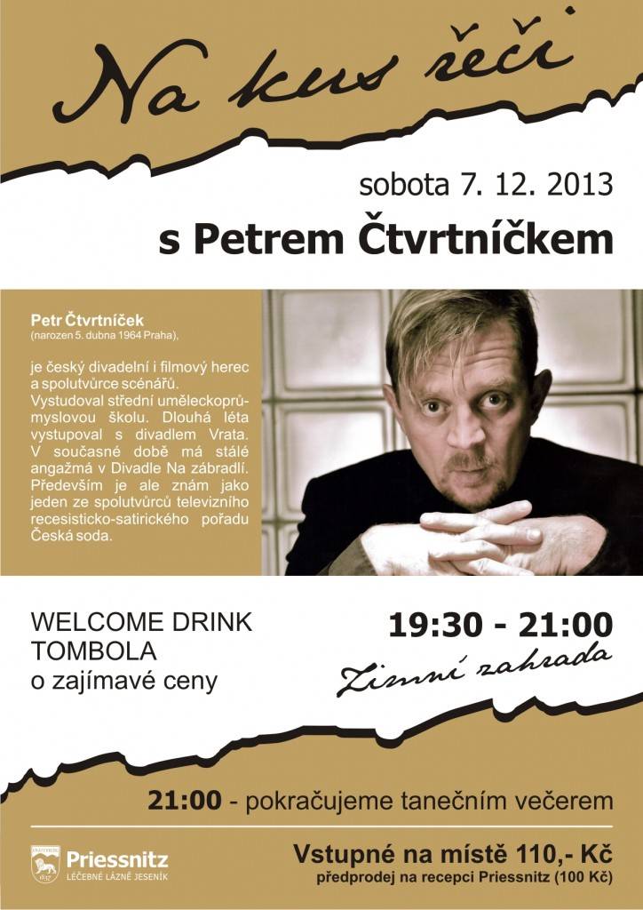 Na kus řeči s Petrem Čtvrtníčkem 7. 12. 2013 Petr Čtvrtníček je český divadelní i filmový herec a spolutvůrce scénářů. Vystudoval střední uměleckoprůmyslovou školu. Dlouhá léta vystupoval s divadlem Vrata. V současné době má stálé angažmá v Divadle Na zábradlí. Především je ale znám jako jeden ze spolutvůrců televizního recesisticko-satirického pořadu Česká soda. WELCOME DRINK 21:00 - pokračujeme tanečním večerem Vstupné 110,- Kč | |