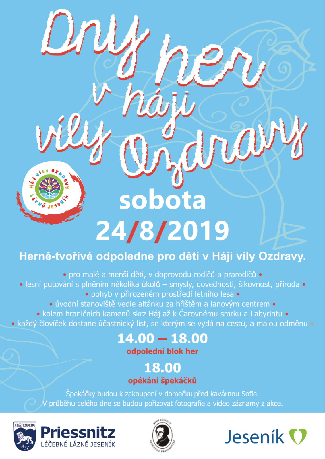 Zveme všechny malé a menší děti, v doprovodu rodičů a prarodičů na herně-tvořivé odpoledne pro děti do Háje víly Ozdravy v sobotu 24. 8. 2019.