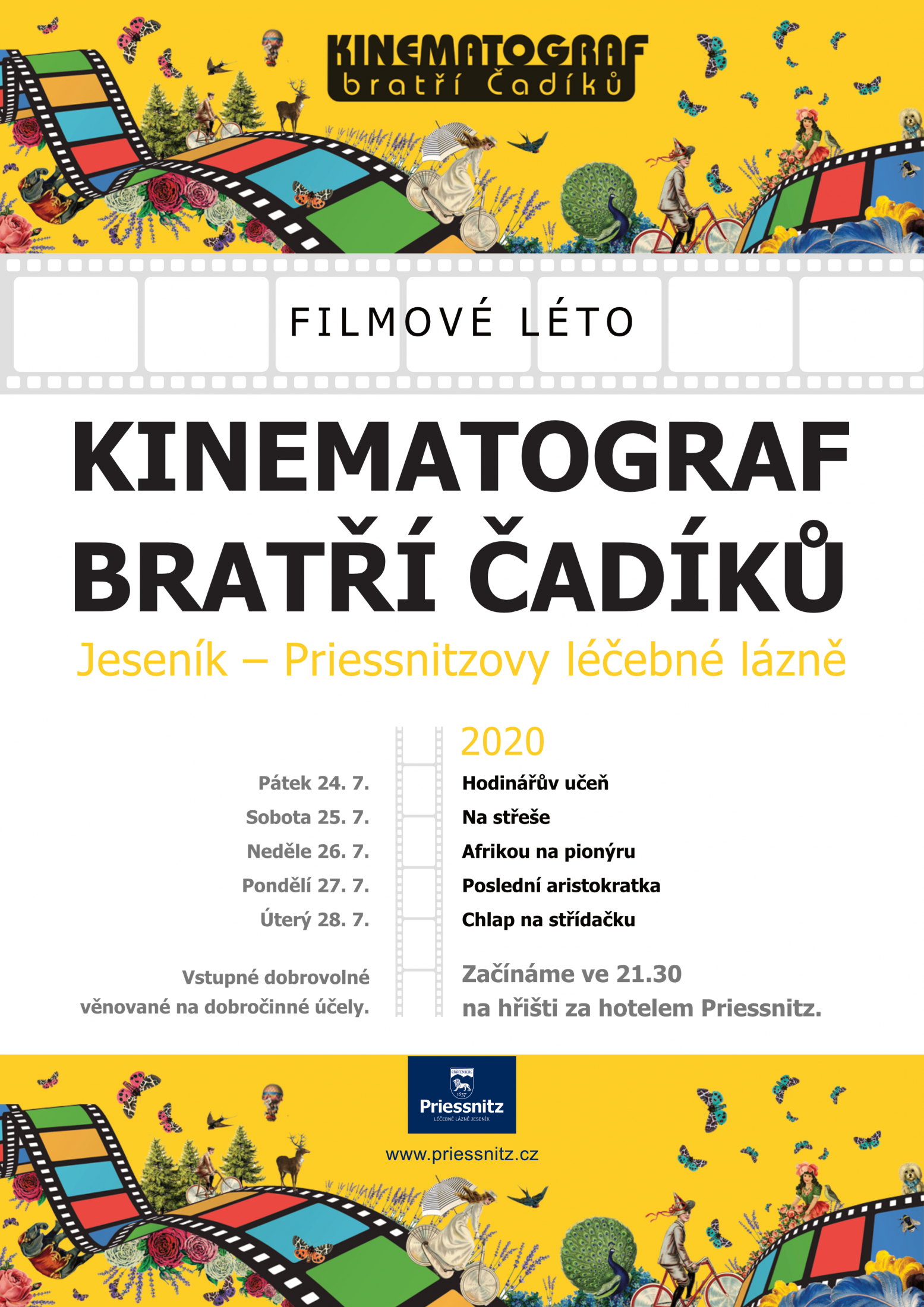 FILMOVÉ LÉTO - KINEMATOGRAF BRATŘÍ ČADÍKŮZveme Vás na letní projekci filmů v rámci oblíbeného a široce vyhledávaného kulturně-filmového charitativního projektu. Hlavní náplní činnosti společnosti je projekt Filmové léto, v jehož rámci se v letních měsících rozjíždějí do desítek měst v České i Slovenské republice projekční vozy vybavené projektory, které zde po několik dnů promítají především české filmy. Pátek 24. 7. 2020 Sobota 25. 7. 2020 Neděle 26. 7. 2020 Pondělí 27. 7. 2020 Úterý 28.7.2020 Začátek projekce v 21:30 na hřišti za hotelem Priessnitz. Vstupné dobrovolné věnované na dobročinné účely. více na www.kinematograf.cz Těšíme se na Vás! | |