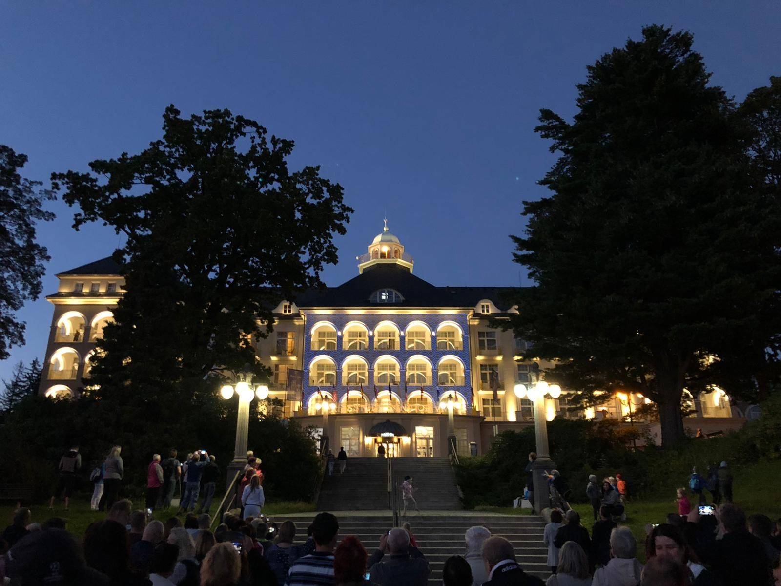 Slavnostní rozsvícení sanatoria PriessnitzV úterý proběhlo za účasti vedení lázní, starostky Jeseníku, zástupců stavebních firem, lázeňských hostů a novinářů slavnostní rozsvícení sanatoria Priessnitz, jako malá připomínka letošní 1.etapy opravy střechy a fasády sanatoria Priessnitz. Zajímavým zpestřením bylo hudební vystoupení trubače na vyhlídkové věžičce a okénko do historie této významné stavby. Další příležitost budou mít návštěvníci lázní v rámci Týdne V. Priessnitze v sobotu 3.10. od 18 hodin. | |