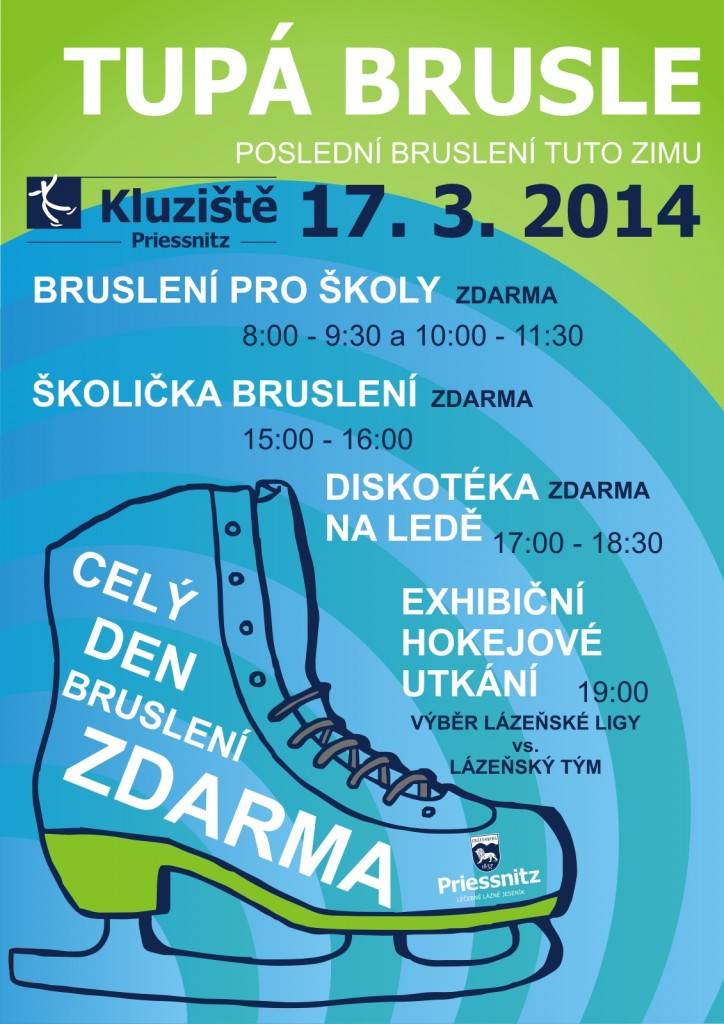 TUPÁ BRUSLE 17. 3. 2014 - Lázeňské kluziště POSLEDNÍ BRUSLENÍ TUTO ZIMU! BRUSLENÍ PRO ŠKOLY 8:00 - 9:30 a 10:00 - 11:30 ŠKOLIČKA BRUSLENÍ 15:00 - 16:00 DISKOTÉKA NA LEDĚ 17:00 - 18:30 EXHIBIČNÍ HOKEJOVÉ UTKÁNÍ 19:00 VÝBĚR LÁZEŇSKÉ LIGY vs. LÁZEŇSKÝ TÝM