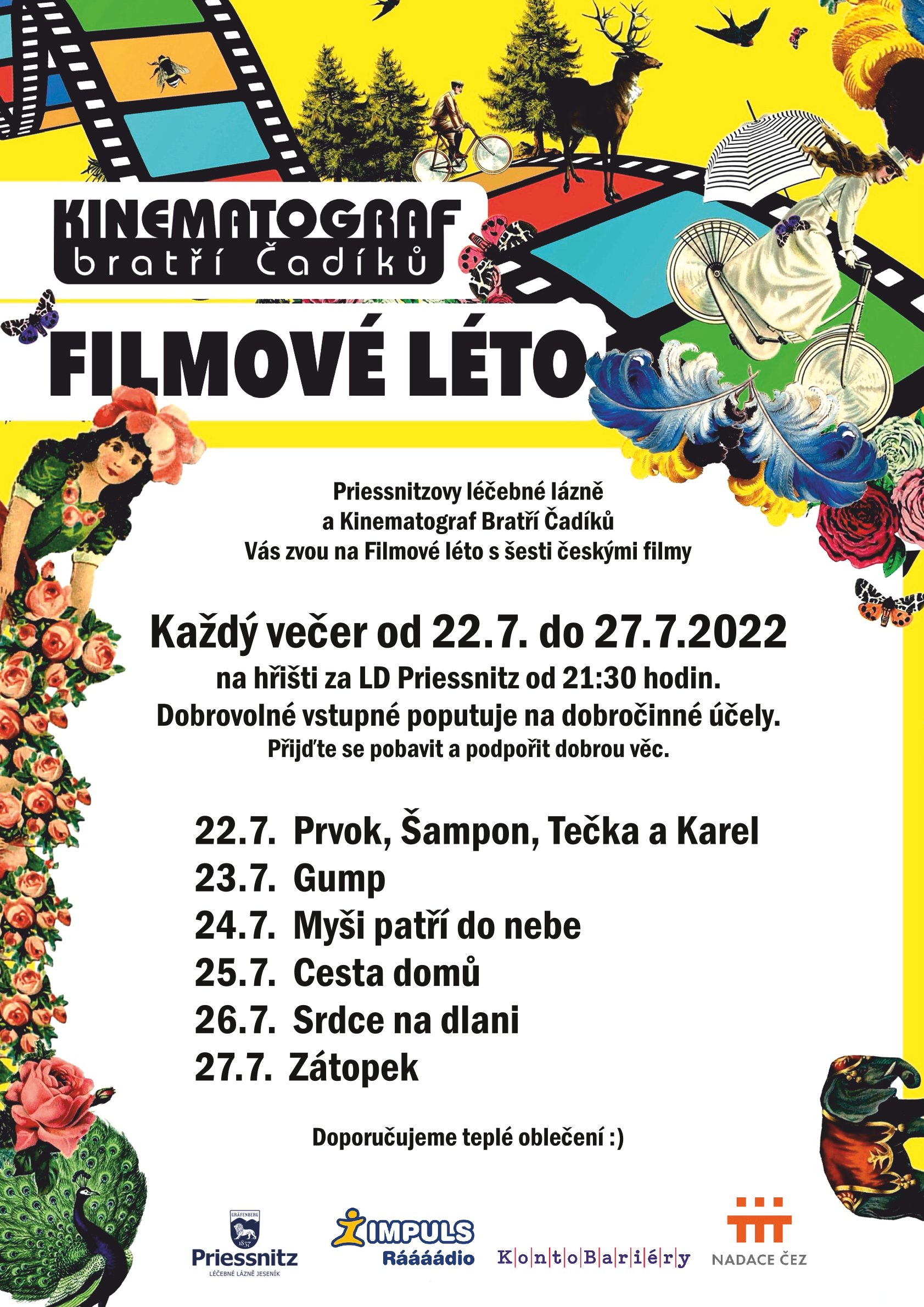 KINEMATOGRAF - Filmové létoPriessnitzovy léčebné lázně a Kinematograf Bratří Čadíků Vás zvou na Filmové léto s šesti českými filmy Každý večer od 22.7. do 27.7. na hřišti za LD Priessnitz od 21:30 hodin. Dobrovolné vstupné poputuje na dobročinné účely. Přiďte se pobavit a podpořit dobrou věc.