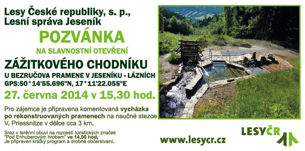 Pozvánka na slavnostní otevření!Příjďte na slavnostní otevření ZÁŽITKOVÉHO CHODNÍKU u Bezručova pramene 27. 6. 2014 v 15:30 hod. Pro zájemce je připravena komentovaná vycházka po rekonstruovaných pramenech na naučné stezce Vincenze Priessnitze v délce cca 3 km (sraz "Pod Enhuberovým hrobem" ve 14:00 hod). | |