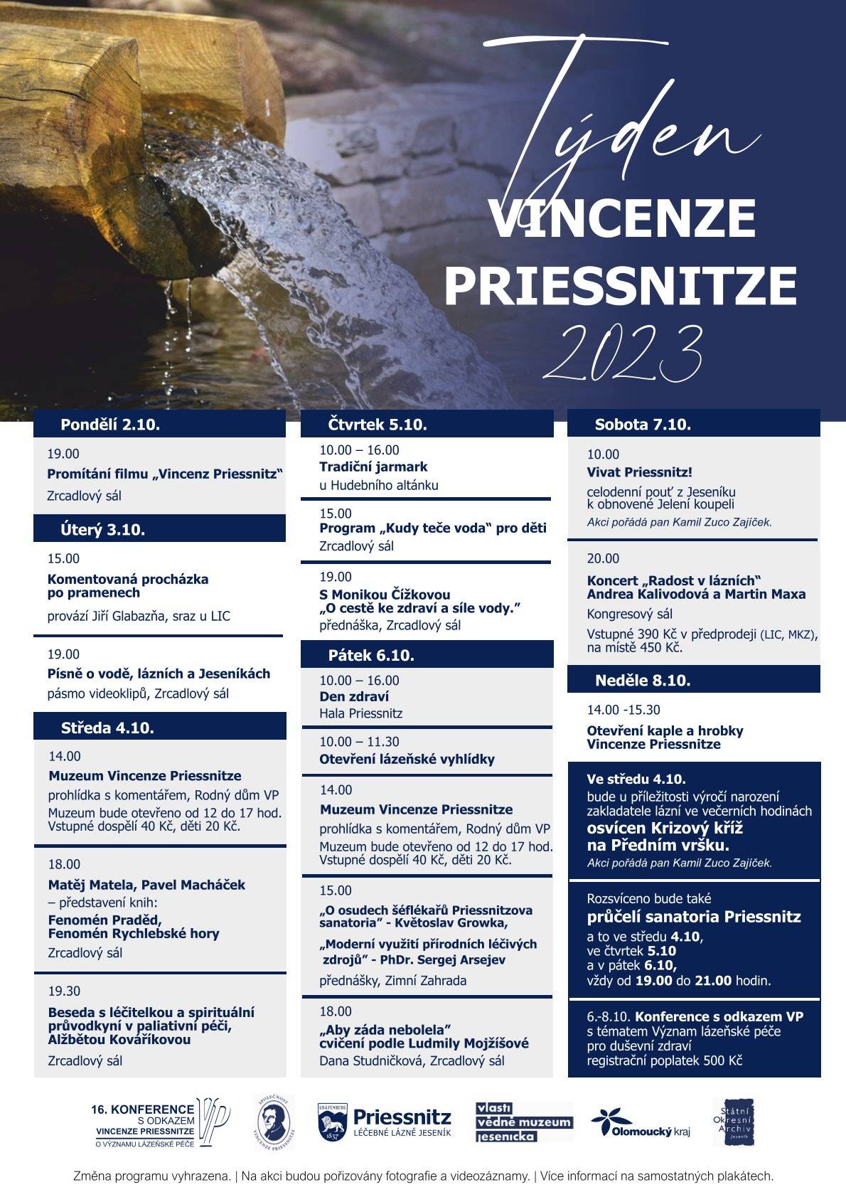 Týden Vincenze Priessnitze 2023Srdečně Vás zveme na tradiční Týden Vincenze Priessnitze, který se bude konat od 2. do 8. 10. 2023, tak využijte příležitost a obihaťte si týden o nabitý program se spoustou zajímavých témat. | |