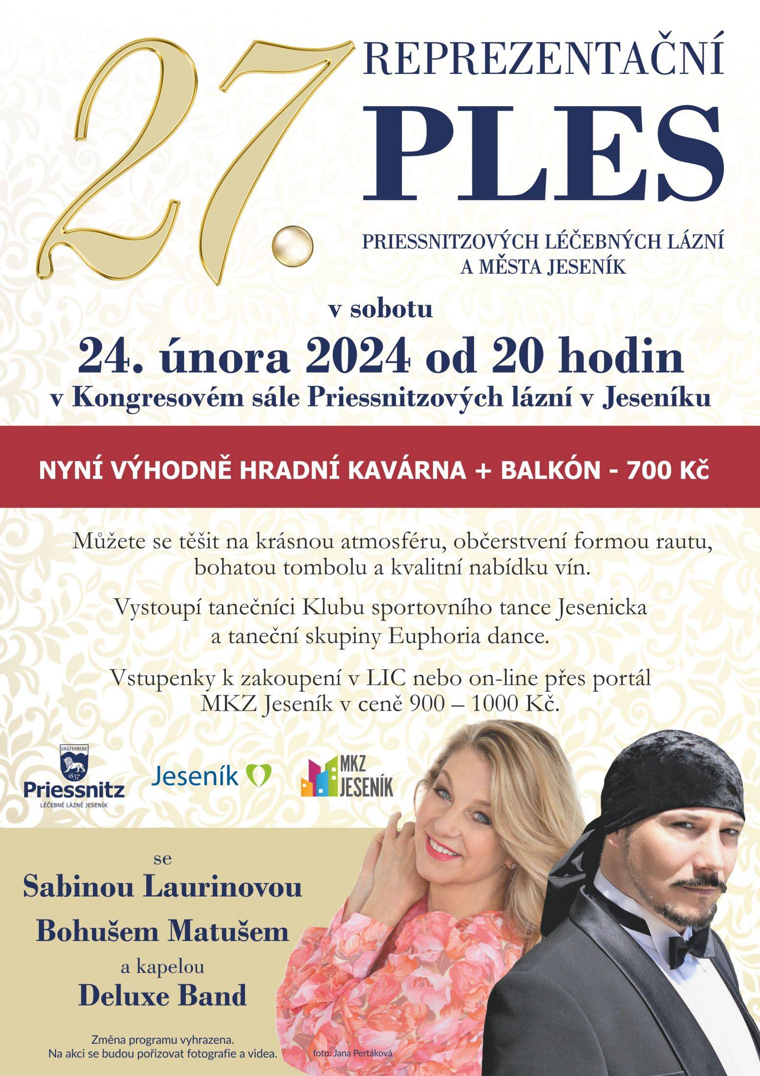 27. REPREZENTAČNÍ PLES Priessnitzových léčebných lázní a Města JeseníkPo čtyřech letech se společně s městem Jeseník vracíme k tradici společných plesů a zveme Vás na 27. REPREZENTAČNÍ PLES Priessnitzových léčebných lázní a Města Jeseník v Kongresovém sále PLL. Vstupenky je možno zakoupit on-line přes portál MKZ Jeseník zde | |