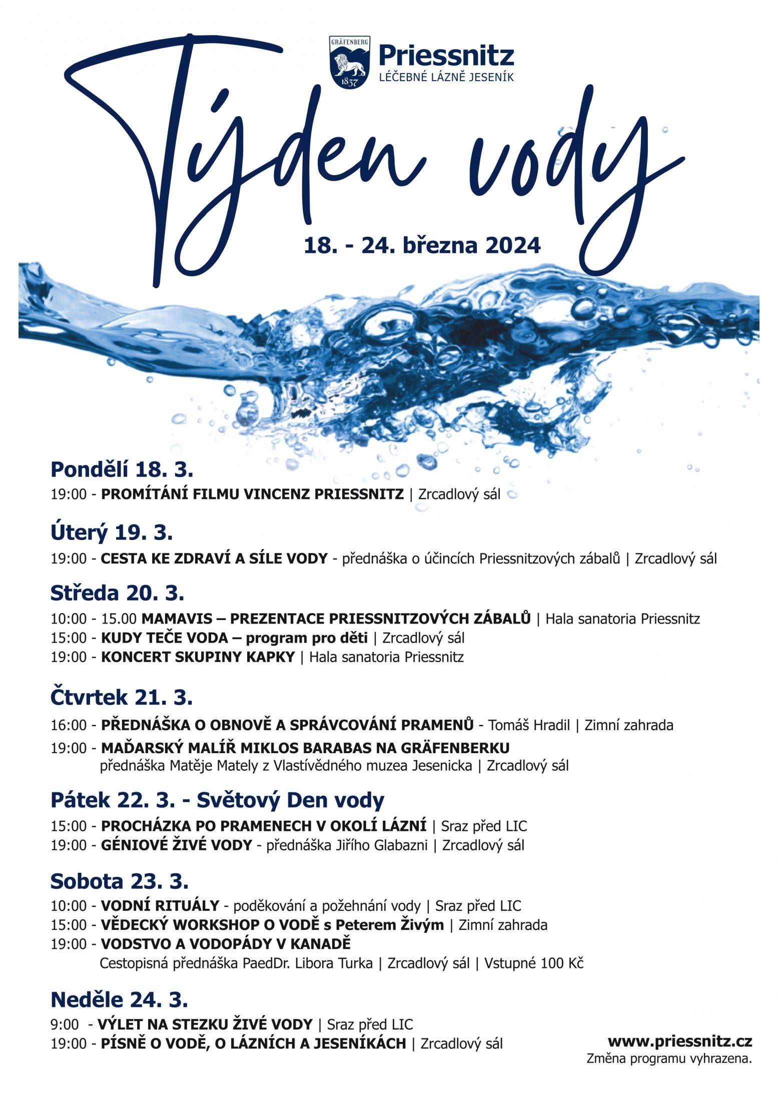 Tý-Den vodyOslavte s námi Světový den vody v lázních, kde voda léčí... Již od roku 1993 si touto tradicí připomínáme, že je voda jednou z nejdůležitějších surovin, která nám byla svěřena. Tato tradice byla zahájena v roce 1993, kdy byl Valným shromážděním Organizace spojených národů 22. březen vyhlášen Světovým dnem vody. V Priessnitzových lázních tomu věnujeme celý týden, a proto zde Tý-den vody znamená PŘEDNÁŠKY, KONCERTY, VÝLETY a mnoho dalšího. Kromě programu na samostatném plakátě také můžete od 26.2. do 28.3. v kavárně Sofie zhlédnout výstavu fotografa Jana Zdichynce na téma "Jesenické vodopády a jiné krásy tohoto kraje"