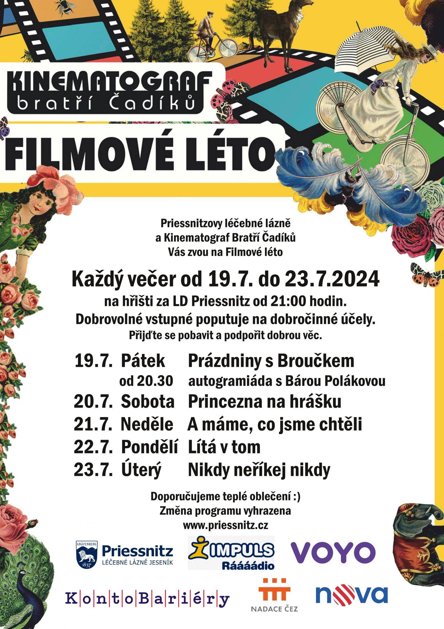 FILMOVÉ LÉTO - KINEMATOGRAF BRATŘÍ ČADÍKŮZveme Vás na letní projekci filmů v rámci oblíbeného a široce vyhledávaného kulturně-filmového charitativního projektu. Hlavní náplní činnosti společnosti je projekt Filmové léto, v jehož rámci se v letních měsících rozjíždějí do desítek měst v České i Slovenské republice projekční vozy vybavené projektory, které zde po několik dnů promítají především české filmy. Pátek 19.7.2024 - Prázdniny s Broučkem Sobota 20.7.2024 - Princezna na hrášku Neděle 21.7.2024 - A máme, co jsme chtěli Pondělí 22.7.2024 - Lítá v tom Úterý 23.7.2024 - Nikdy neříkej nikdy Vstupné dobrovolné věnované na dobročinné účely. více na www.kinematograf.cz Těšíme se na Vás! | |