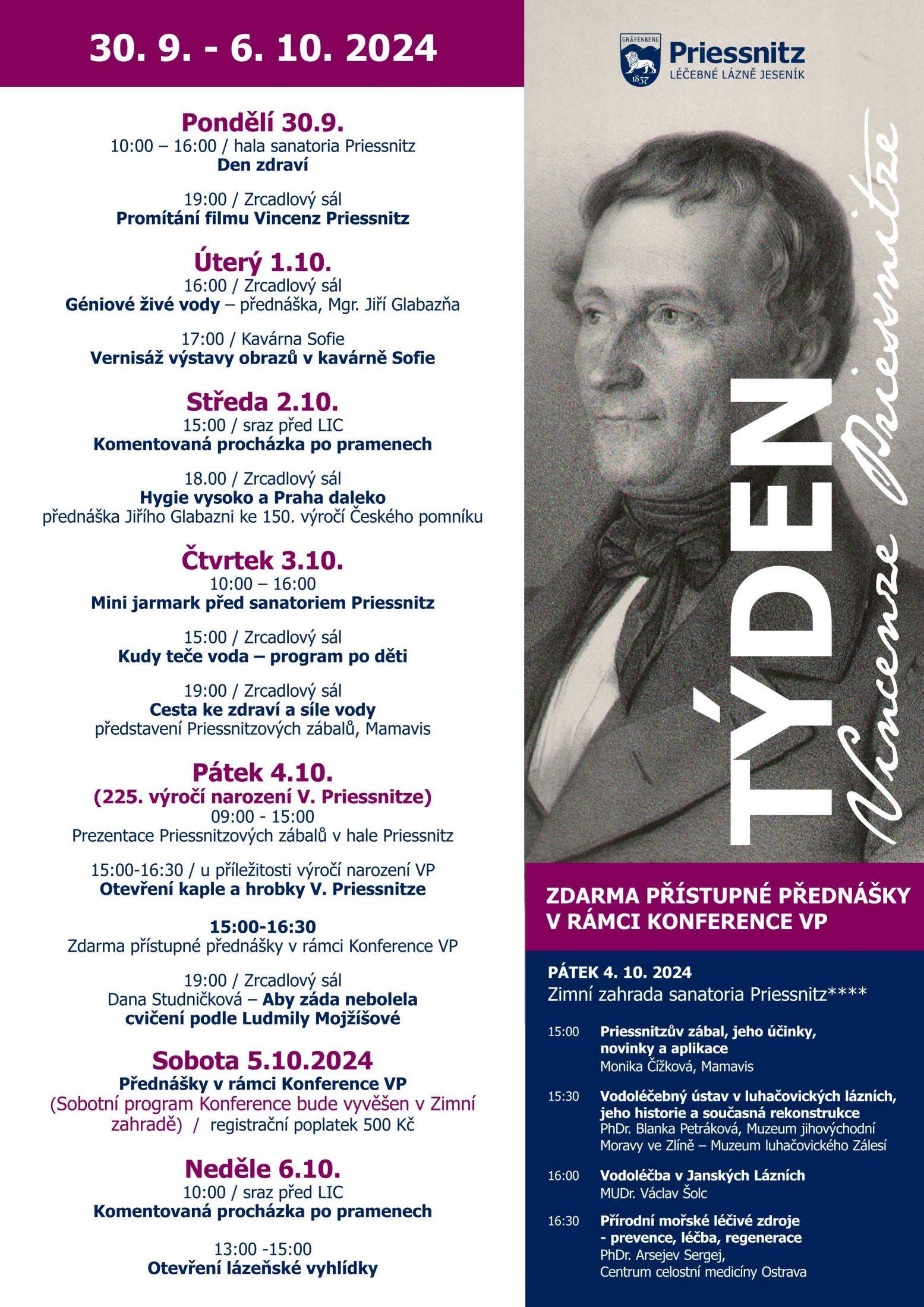 Týden Vincenze PriessnitzeSrdečně Vás zveme na tradiční Týden Vincenze Priessnitze, který se bude konat od 30. 9. do 6. 10. 2024. Opět nás čeká nabitý program se spoustou témat, v pátek 4. 10. 2024 (v den 225. výročí narození Vincenze Priessnitze), máte navíc možnost v Zimní zahradě navštívit zdarma přednášky v rámci 17. ročníku konference VP, kde se se svými tématy představí odborníci z různých odvětví zdravotnictví. | |