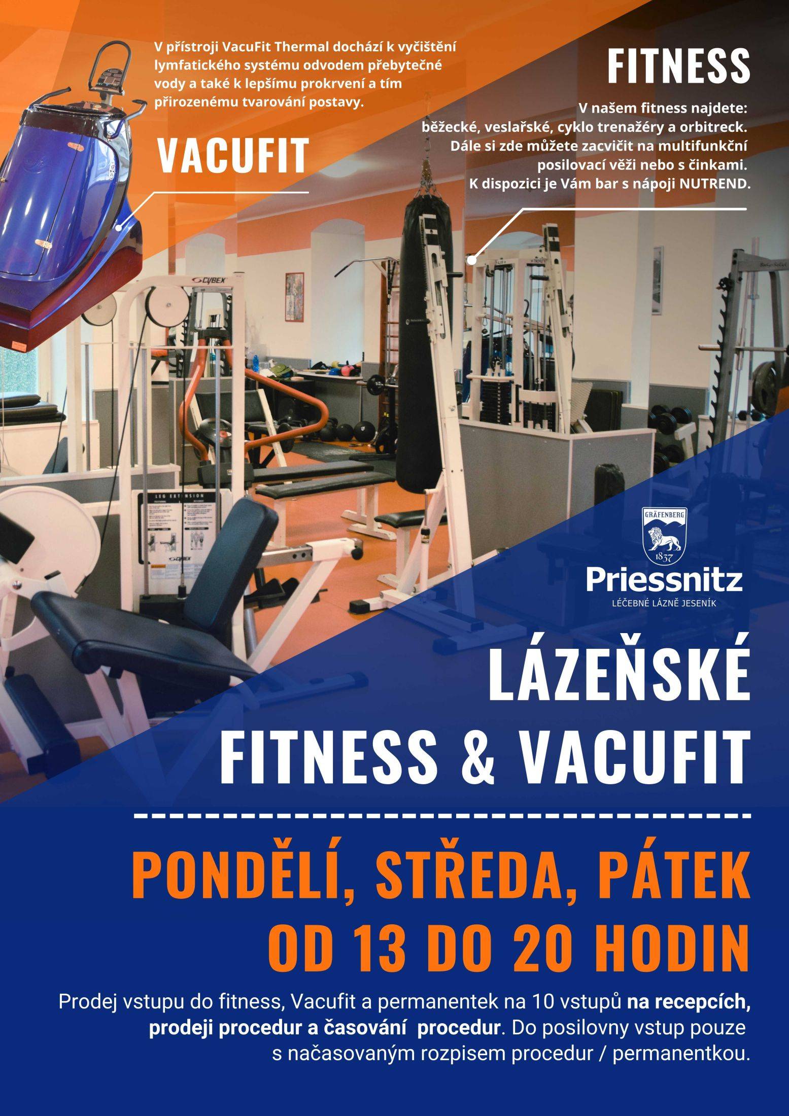 Lázeňské fitnessV našem fitness najdete: běžecké, veslařské, cyklo trenažéry a orbitreck. Dále si zde můžete zacvičit na multifunkční posilovací věži nebo s činkami. K dispozici je Vám bar s nápoji NUTREND. Vacufit - V přístroji VacuFit Thermal dochází k vyčištění lymfatického systému odvodem přebytečnévody a také k lepšímu prokrvení a tím přirozenému tvarování postavy. Ceník:Posilovna: jednorázové vstupné: 130 Kč, permanentka 10 vstupů 980 Kč VacuFit: 1 vstup 130 Kč/ 30 minut, permanentka 10 vstupů 980 Kč. Prodej vstupu do fitness, Vacufit a permanentek na 10 vstupů na recepcích, prodeji procedur a časování procedur. Do posilovny vstup pouze s načasovaným rozpisem procedur / permanentkou. Provozní doba (mezisezóna):