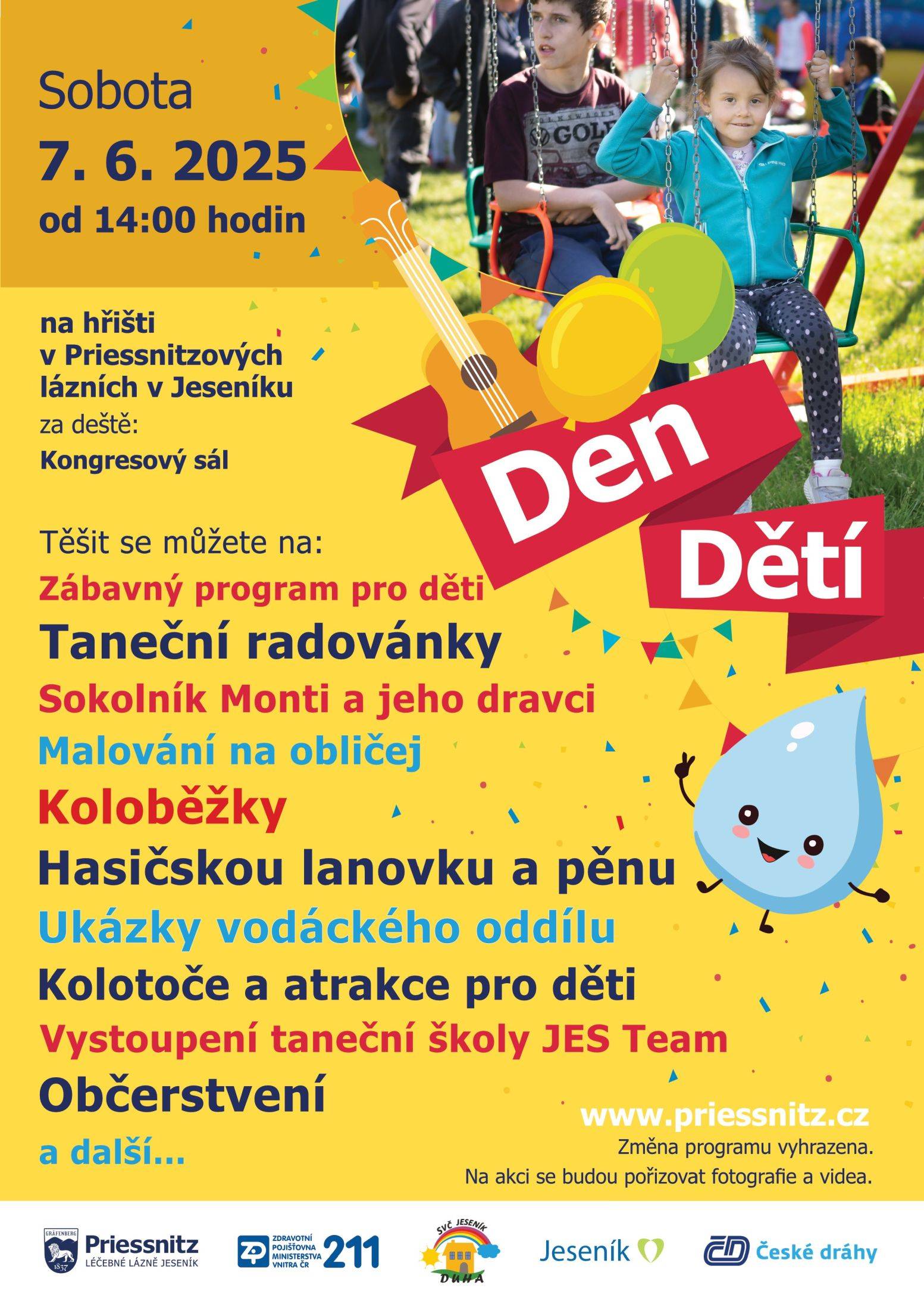 Den dětíV sobotu 7. 6. 2025 od 14 hodin Vás zveme na dětské odpoledne v Priessnitzových léčebných lázních na hřišti za sanatoriem Priessnitz. Můžete se těšit na taneční radovánky, sokolníka Montiho, vodáky, hračky, suvenýry, kolotoče a občerstvení. V průběhu celé akce se budou pořizovat fotografie a videozáznamy. V rámci akce je nutné dodržet nařízená hygienická opatření. Děkujeme za pochopení. Akci Den dětí finančně podpořilo Město Jeseník. | |