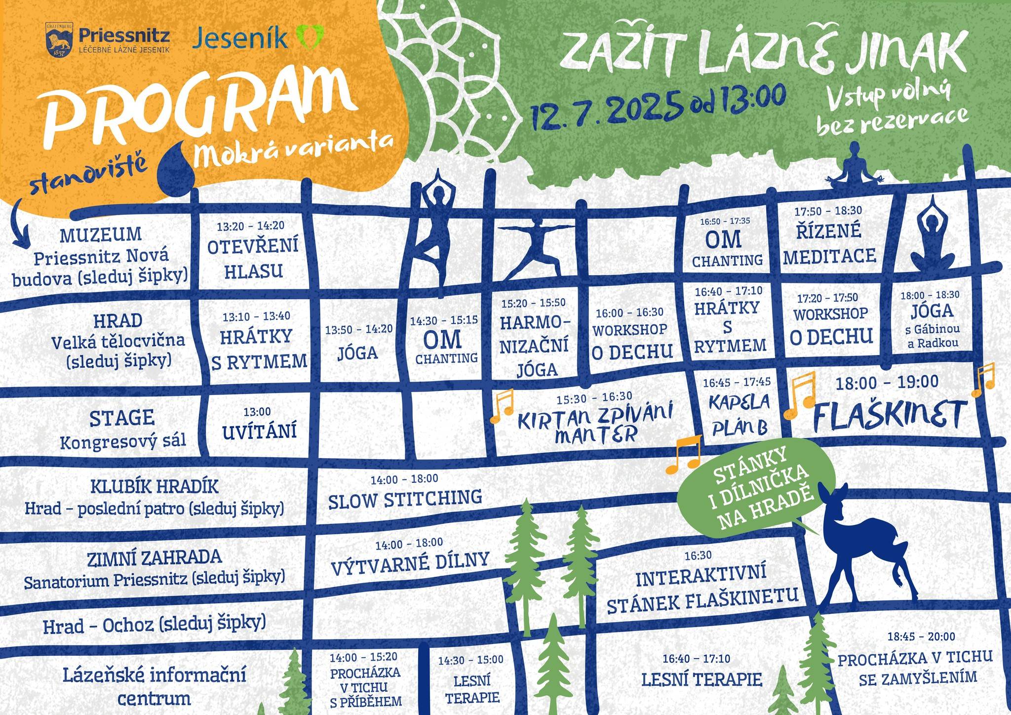 Můžete využít nabídku jógy na louce, bubnování či rady jak správně dýchat, které povedou naše zkušené lázeňské lektorky, stezku ve tmě, relaxační a odpočinkovou muziku na malé stage, nebo výtvarné dílny pro malé i velké.