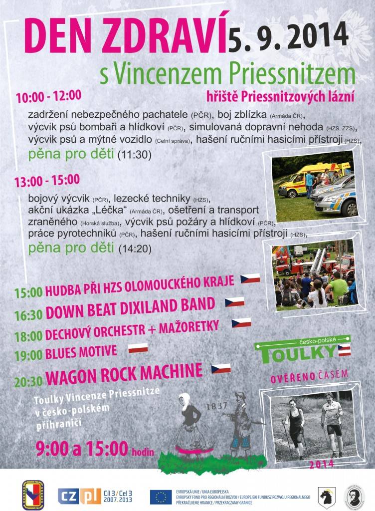 DEN ZDRAVÍ s Vincenzem Priessnitzem5. 9. 2014, hřiště Priessnitzových lázní 10:00 - 12:00 13:00 - 15:00 15:00 HUDBA PŘI HZS OLOMOUCKÉHO KRA JE Toulky Vincenze Priessnitze v česko-polském příhraničí9:00 a 15:00 hodin | |