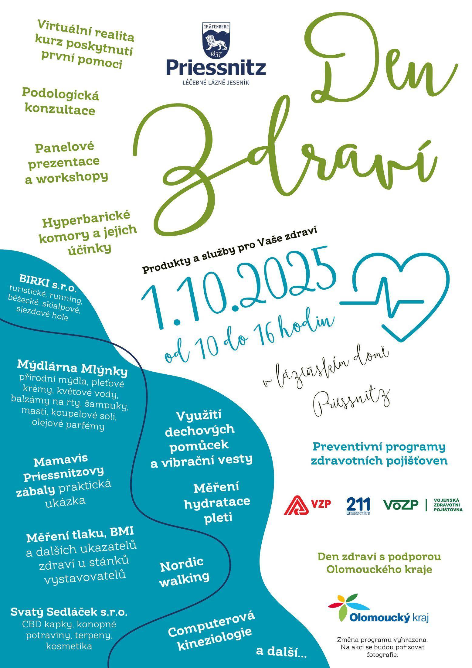 Den zdraví1.10.2025 Vás zveme na tradiční Den zdraví v Priessnitzových léčebných lázních, kde se představí firmy a produkty podporující zdraví a zdravý životní styl, čeká vás poradenství o benefitech a příspěvcích zdravotních pojišťoven a o možnostech prevence v oblasti zdraví. Proběhnou praktické instruktáže a prodej výrobků souvisejících se zdravím. Akci pořádáme s podporou Olomouckého kraje. | |