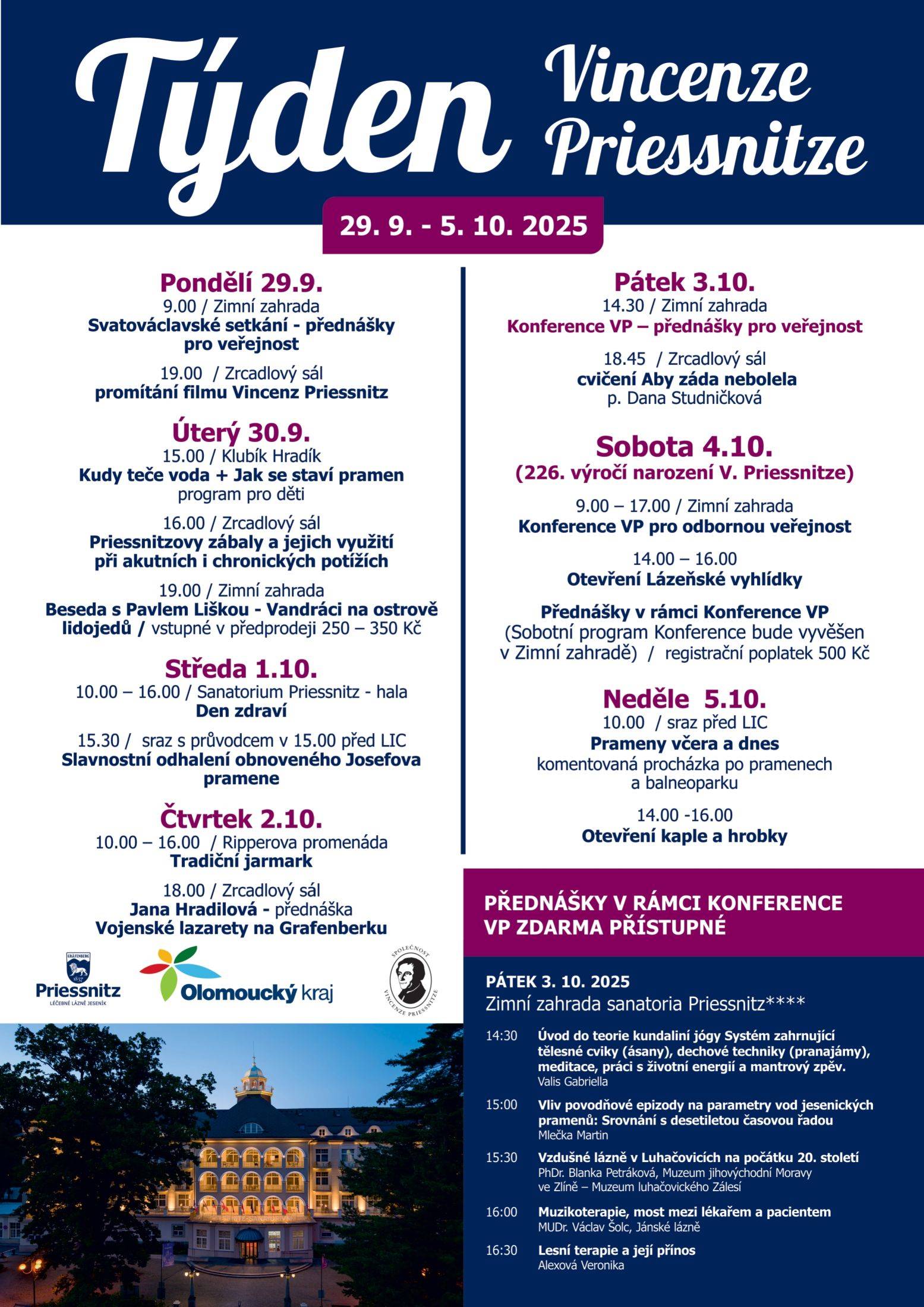 Týden Vincenze PriessnitzeSrdečně Vás zveme na tradiční Týden Vincenze Priessnitze, který se bude konat od 29. 9. do 5. 10. 2025. Týdnem Vincenze Priessnitze si každoročně připomínáme výročí narození zakladatele našich lázní Vincenze Priessnitze, který se narodil 4.10.1799 zde na Gräfenberku. Opět nás čeká nabitý program se spoustou témat, v pátek 3. 10. 2025, máte navíc možnost v Zimní zahradě navštívit zdarma přednášky v rámci 18. ročníku konference VP, kde se se svými tématy představí odborníci z různých odvětví zdravotnictví. Těšíme se na Vás. | |