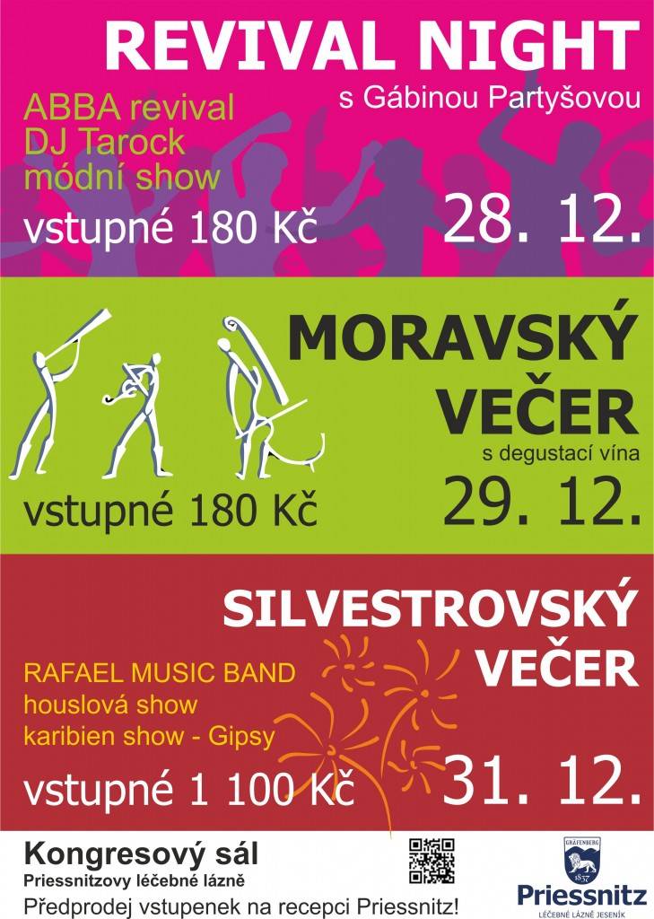 Sváteční akcePředprodej vstupenek na recepci Priessnitz! REVIVAL NIGHT s Gábinou Partyšovou28. 12. - Kongresový sál ABBA revival vstupné 180 Kč MORAVSKÝ VEČER s degustací vína29. 12. - Kongresový sál vstupné 180 Kč SILVESTROVSKÝ VEČER31. 12. - Kongresový sál RAFAEL MUSIC BAND vstupné 1 100 Kč | |