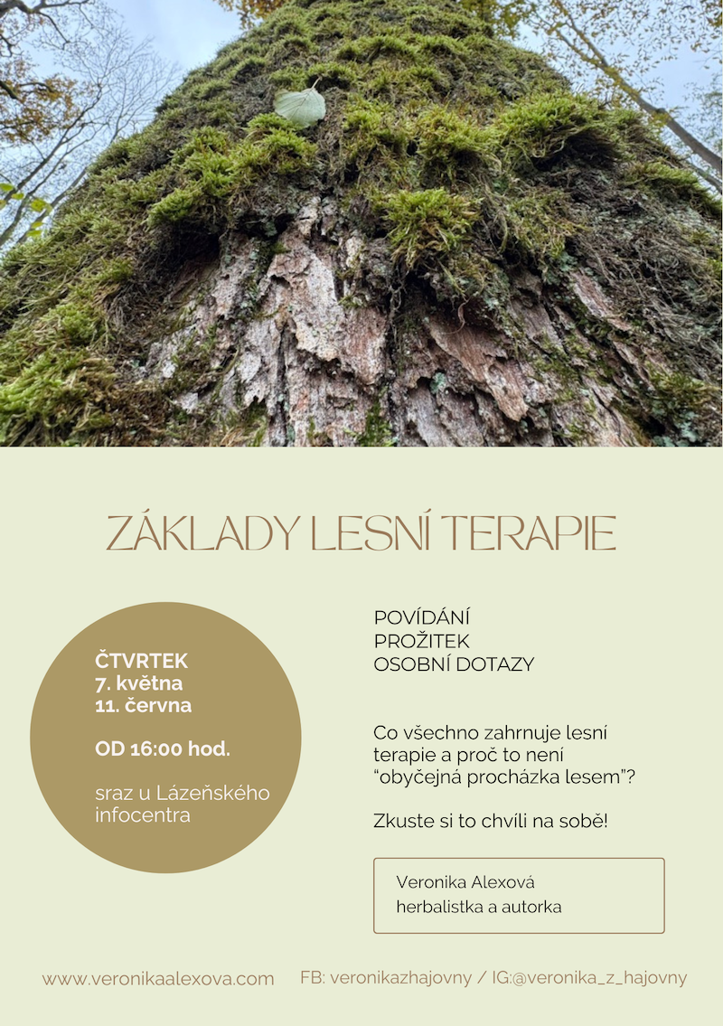 | ZÁKLADY LESNÍ TERAPIE - Pod širým nebem / festivaly 07.05.2026 od 16:00 do 17:00 hod. Sraz před LIC PLL, Jeseník | MapaPřijďte si užít povídání i praktickou ukázku lesní terapie. V prostoru louky a stromů, skrze zapojení všech smyslů, jemného pohybu, dechu a hlavně - plné pozornosti. Vezměte si s sebou něco, na co si na louce můžete sednout. Program v rámci Akademie zdraví, vstupné dobrovolné