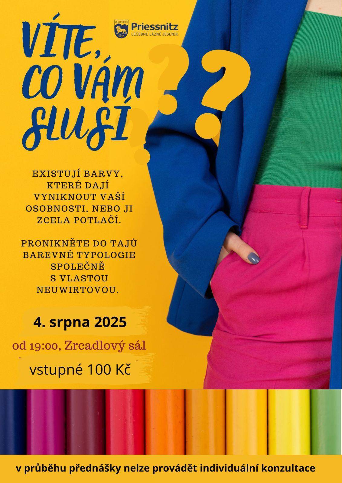 | 11.12.2025 od 19:00 do 20:30 hod. Priessnitzovy léčebné lázně a.s., Zrcadlový sál, Jeseník | MapaTypologie a vizážistika s paní Vlastou Neuwirtovou. Vstupné 100 Kč.