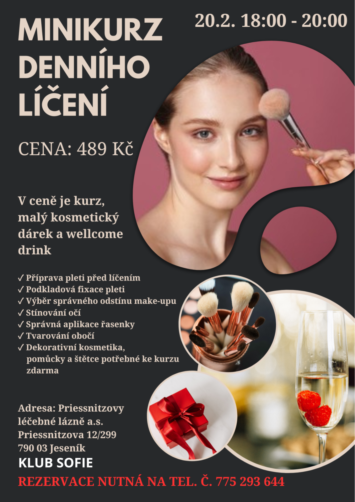 Dopřejte si večer jen pro sebe a naučte se, jak podtrhnout svou přirozenou krásu. Na minikurzu denního léčení vás zkušená lektorka provede základy správné péče o pleť, výběru vhodných odstínů a technik, které využijete každý den. Čeká vás praktická ukázka, tipy na jednoduché a elegantní líčení i prostor pro vaše dotazy. Cena 489 Kč. V ceně kurzu je wellcome drink a malý kosmetický dárek. Rezervace na tel. č. 775 293 644