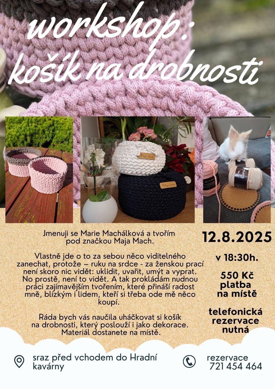 WORKSHOP – KOŠÍK NA DROBNOSTI (Workshopy) 18.11.2025 od 18:30 do 20:30 hod. Klub SOFIE, Jeseník | Mapa Pod vedením lektorky paní Marie Machálkové se naučíte uháčkovat košík na drobnosti, který poslouží i jako dekorace. Materiál dostanete na místě. Telefonická rezervace nutná (tel.č.721 454 464). Platba 550 Kč na místě (v ceně je veškerý potřebný materiál). | |