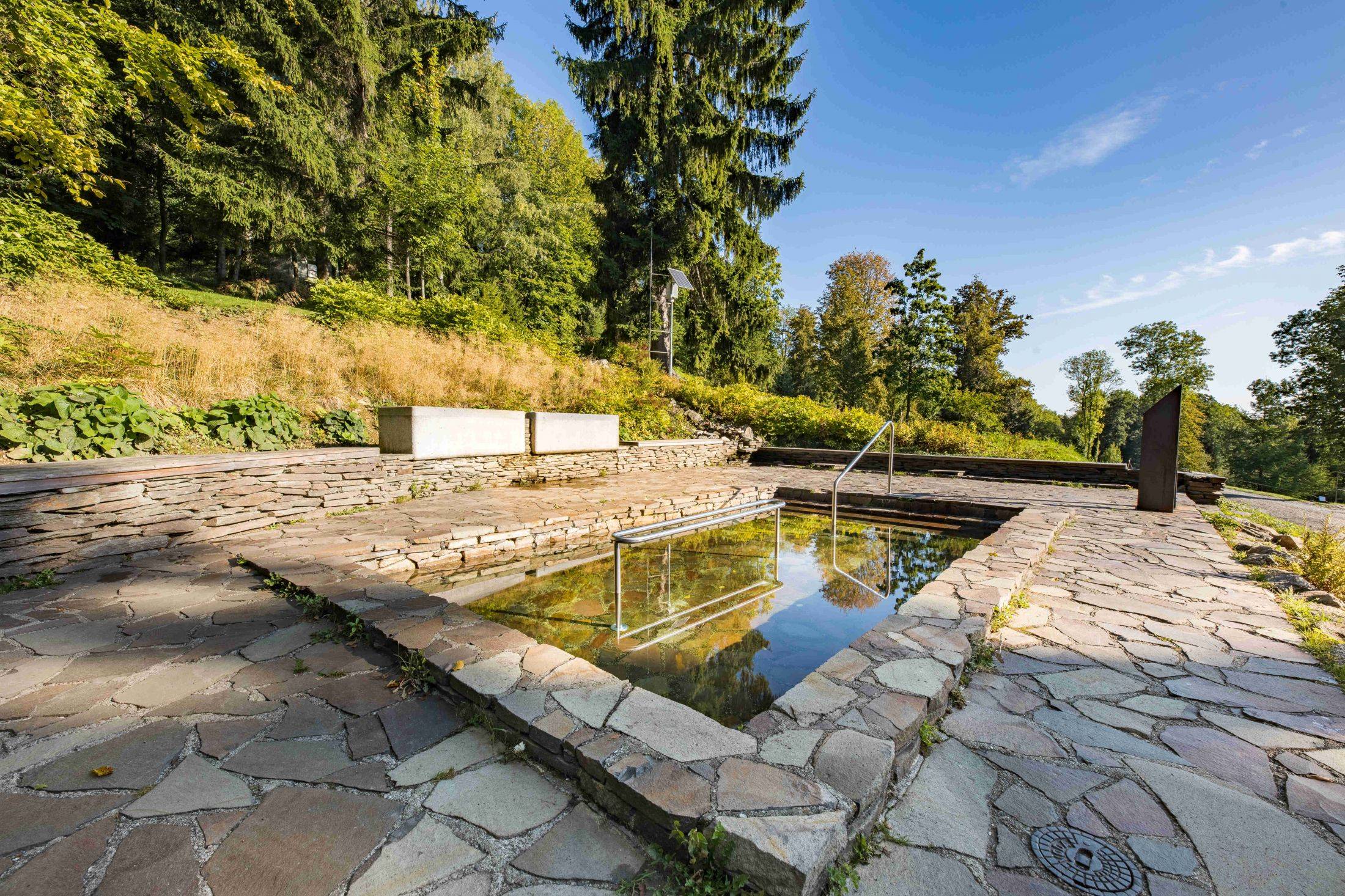 | Kleines Wasserbecken mit Wasseroberflächenhöhe von 60 cm für das Bad der Beine und Granitbadewannen für das Bad der Oberarme. In dem kleinen Becken für die Beine wird der Gang des Storchmarschs angewendet. Beim Bad der Oberarme werden die Arme in die Granitwanne eingetaucht. |  |