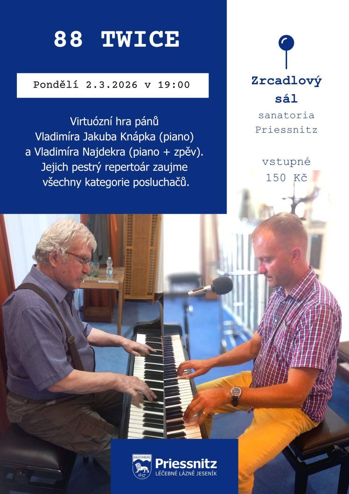 KONCERT 88TWICE (Koncerty) 02.03.2026 od 19:00 do 20:00 hod. Priessnitzovy léčebné lázně a.s., Zrcadlový sál, Jeseník | Mapa Dvě piana, dva muži a krásné (nejen) jazzové melodie. Vstupné 150 Kč. | |
