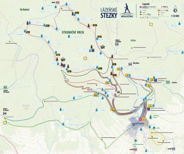 TrailsVincenz Priessnitz stressed the importance of spending time walking outside. He used to encourage the patients go for long walks in the surrounding forests, during which they took a nature shower, drank spring water, sunbathed, and walked in dew with bare feet.Get to know Gräfenberg Walking and discover the magical surroundings of the first water-cure spa in the world. There are plenty of new trails out there for you: Lion Trail DLength: 1,7 km, Difficulty: easy trail suitable for all spa guests, also for patients suffering from asthma bronchiale, coronary artery disease Theme points: Hygie Statue (Czech Spring), Polish Monument, Hungarian Monument Jubilee Trail D+Length: 1,5 km Difficulty: easy trail suitable for all spa guests, also for patients suffering from asthma bronchiale, coronary artery disease Theme points: Hygie Statue (Czech Spring), Chapel – Vincenz Prinessnitz Tomb Herbs Trail CLength: 1,2km Difficulty: easy trail suitable for all spa guests, also suitable for children Theme points: DiscGolf course, Herbs garden Romanian Trail C+Length: 2,9 km Difficulty: intermediate trail suitable for all spa guests, patients suffering from asthma bronchiale, coronary artery disease can hike the trail in time intervals. Theme points: Slavic Spring, Romanian Spring, Southern Hillside Bezruč Trail BLength: 2,5km Difficulty: slightly difficult trail with high elevation suitable for physical exercise. Unsuitable for asthma bronchiale, coronary artery disease, symptomatic cardiac patients. Theme points: Slavic Spring, Bezruč Spring, Romanian Spring Polish Trail B+Length: 5km Difficulty: slightly difficult trail with high elevation suitable for physical exercise. Unsuitable for asthma, symptomatic cardiac patients. Theme points: Polish Spring, Nassau Stone, Vilém`s Stone, Enhuber`s Tombstone Jitřní Trail ALength: 5,5km Difficulty: difficult trail with high elevation suitable for physical exercise. Unsuitable for asthma bronchiale, coronary artery disease, symptomatic cardiac patients. Motivation points: U Mnicha Junction, Enhuber`s Tombstone, Hydropathic Rocks, Evening Spring, Priessnitz Spring Nassau Trail A+Length: 6,5km Difficulty: difficult trail with high elevation suitable for physical exercise. Unsuitable for asthma bronchiale, coronary artery disease, symptomatic cardiac patients. Theme points: Polish Spring, Nassau Stone, Vilém`s Stone, František`s Rock, Priessnitz Spring, Jitřní Spring, Enhuber`s Tombstone Children Trail KLength: 1,9km Difficulty: intermediate trail designed for children. Theme points: Slavic Spring, Bezruč Spring Walkie: Make yourself a photo at the Experience Sidewalk, send us the picture to walkie@priessnitz.cz and win a free stay in Priessnitz Spa Resort. Condition Trail K+ Length: 7,7km Difficulty: intermediate long trail suiteble for spa guests suffering from depression, anxiety, chronic stress, recuperating from thyroid gland operation, having hightened blood pressure, or undeveloped coronary artery disease and asthma bronchiale. The trail is also designed for those willing to improve their physical fitness. Theme points: U Mnicha Junction, Arnošt Hayrack, U Pomezí, Bern Rest Place, St. Christopher Chapel Vincenz Priessnitz Trail NLength: 5,7km Difficulty: difficult trail with higher elevation. Unsuitable for asthma bronchiale and symptomatic cardiac patients. Theme points: Prague Spring, Svornost Rest Place, Romanian Spring, Jitřní Spring, Hydropathic Rocks, Enhuber`s Tombstone, Polish Spring Lively water trail N+Length: 10,3km Difficulty: difficult trail with high elevation suitable for physical exercice. Unsuitable for asthma bronchiale and symptomatic cardiac patients. Theme points: Enhuber`s Tombstone, U Sokolího vrch, Finnish Spring, Ripper Stone, Šárka Spring, Priessnitz Spring, Jitřní Spring |